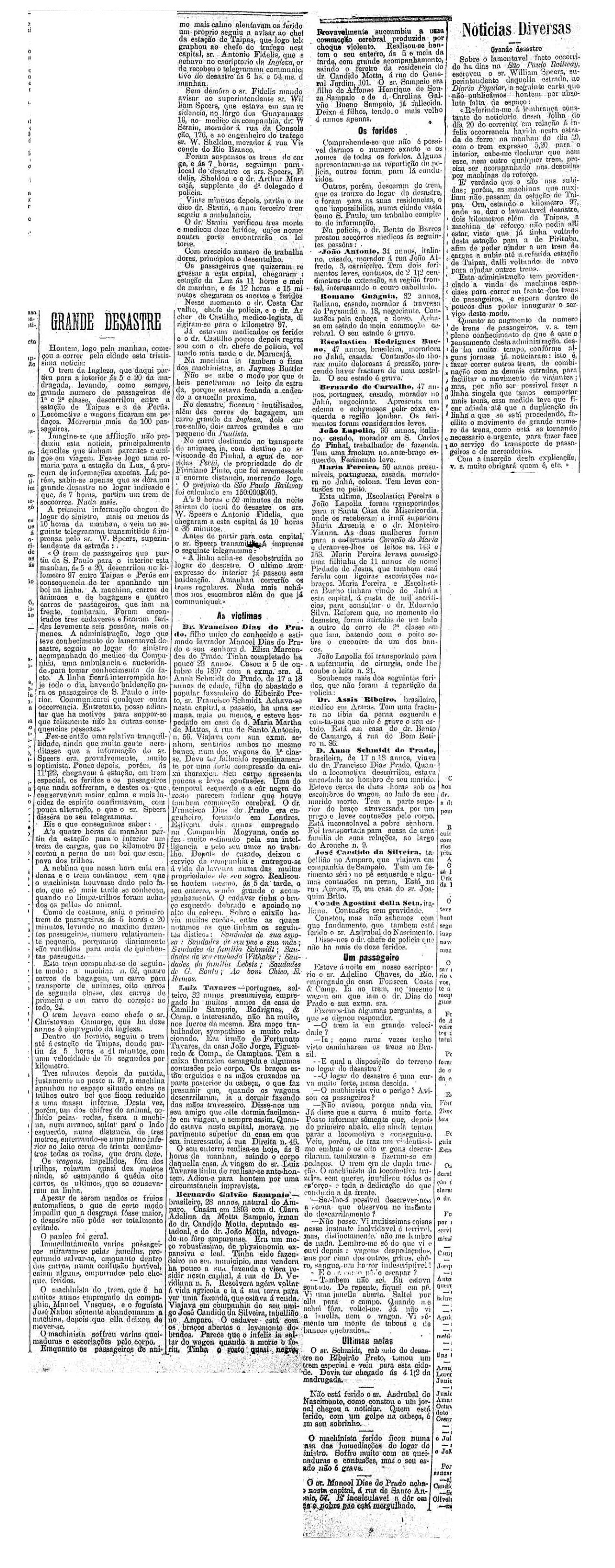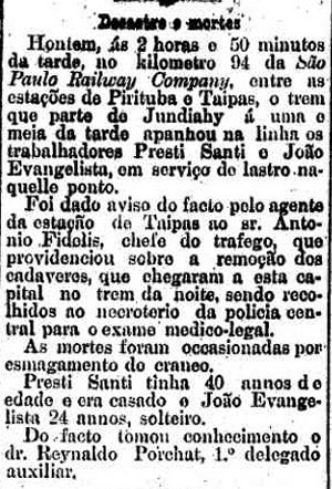 AO LADO: Outro desastre entre Perus e Taipas (Jaraguá) mata pelo menos dois funcionários da ferrovia, entre as quais integrantes da alta sociedade paulista da época (O Estado de S. Paulo 20 e 18/01/1899). |
