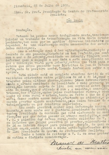 em Comissão do Grupo Escolar de Pirambóia, 23/07/1935). (VEJA A CARTA NO CAIXA ABAIXO, DE 1935).