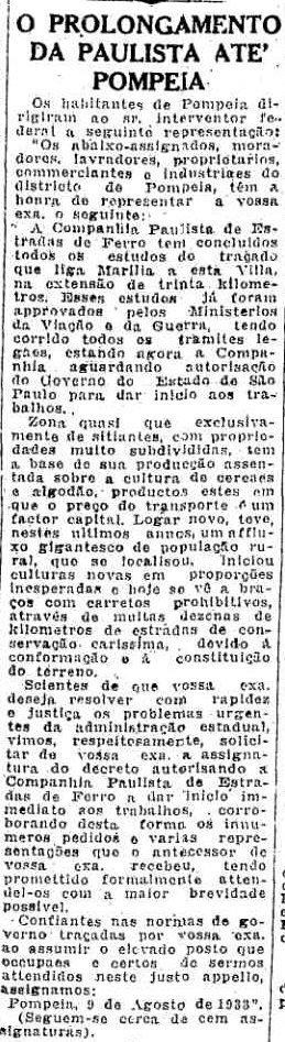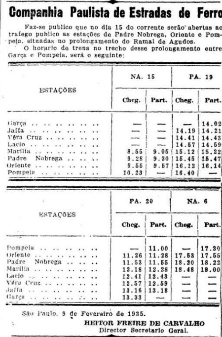 1935 - ACIMA: O primeiro horario dos trens de e para Pompeia ( O Estado de S. Paulo, 10/2/1935).