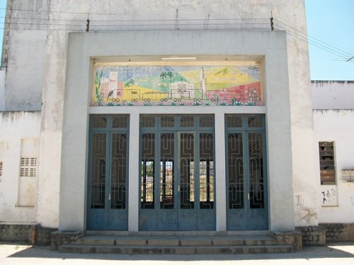 Sua fachada é ornamentada por um painel decorativo, da autoria de