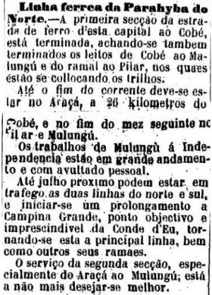 AO LADO: As obras da ferrovia já estavam seguindo para Independencia (depois chamada de Guarabira), além de outras estações na região em fevereiro de 1877 (A Provincia de S. Paulo, 24/02/1883). |