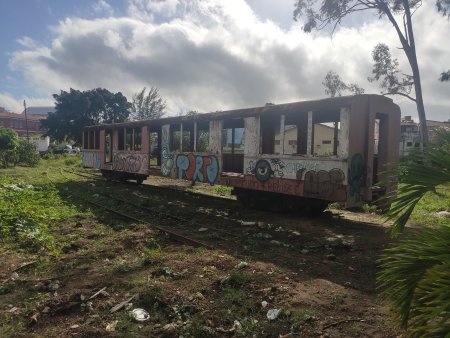 ACIMA: Carro de passageiros abandonado em 2021 junto à antiga estação (Foto Julio Alves).