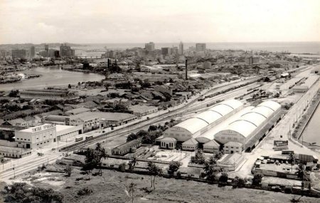 ACIMA: Mapa do município de Recife nos anos 1950. A linha Recife-Maceió da RFN (linha Sul) parte para o