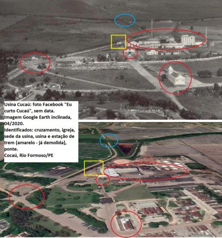 ACIMA: Usina Cocau, ainda ativa em 2020 O retangulo amarelo mostra onde ficava a estação, já demolida - CLIQUE SOBRE A FOTO PARA VÊ-ÇA EM TAMANHO MAIOR (Google Maps, 2020).