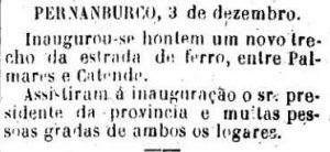 AO LADO: Foram vinte anos para a linha alcançar o que na época era a estação de Catende (A Provincia de S. Paulo, 6/12/1882). |