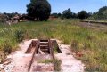 esparsos de construção, entre eles um poço de inspeção de locomotivas.