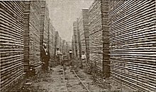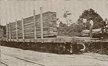 ( à esquerda) um vagão carregado de pranchas de madeira;