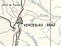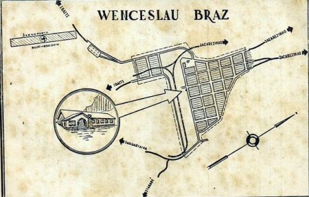 ACIMA: Pátio ferroviário em Wenceslau Braz em 1952. A figura de construção mostra o prédio do Ferroviário Esporte Clube. As linhas e estradas saem para Ibaiti (à direita) e Jacarezinho (à direita, Jaguariaíva (para a esquerda, mais embaixo) e para baixo, Itararé. Difícil saber o que é linha e o que é estrada (Correio dos Ferroviarios, janeiro de 1952).