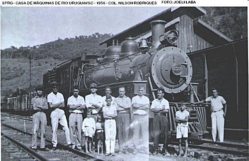 Casa de locomotivas em Rio Uruguai com a locomotiva e o pessoal,
