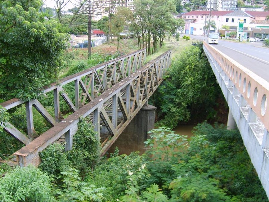 ACIMA: Ponte ferroviária em sobre o Rio das Pedras em