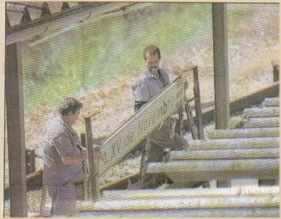 funcionários da CPTM retiram a placa. Era o fim. Foto