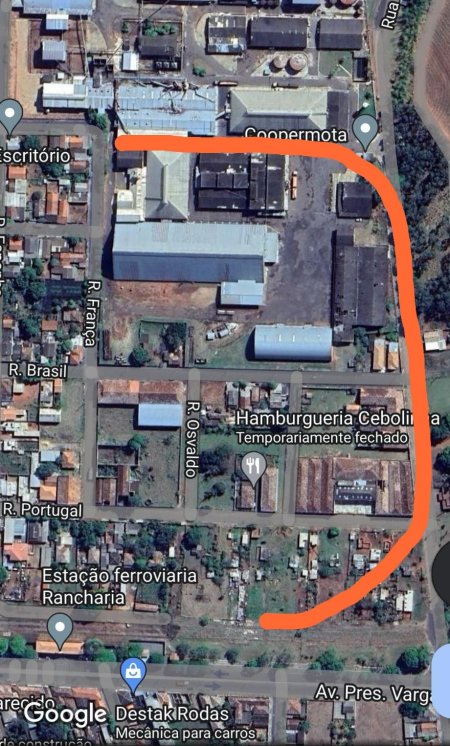 ACIMA: A linha vermelha mostra o percurso de um ramal industrial, hoje já desativado, em vista do Google Maps de outubro de 2023. Alguns trilhos ainda estão no local.