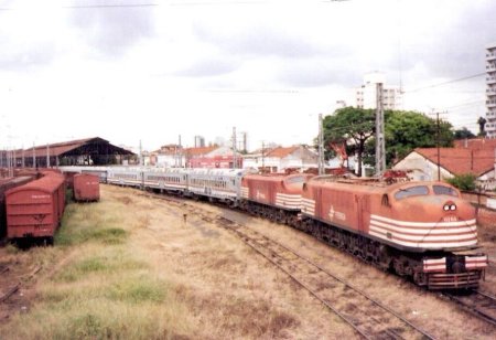ACIMA: Trem de passageiros deixando a estação de Rio Claro-nova em novembro de 1996, sentido interior. A segunda locomotiva V-8 está "morta", ou seja, só vai ser ligada em Itirapina, para tracionar os vagões que seguiriam para Panorama (Foto e texto Vanderley Zago).