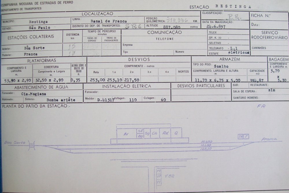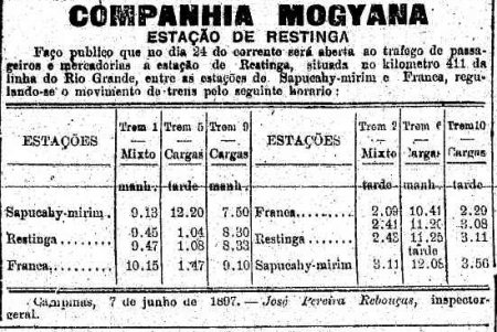 de Restinga foi aberta em 24 de junho de 1897, segundo o relatório da Mogiana deste dia e também o aviso e horário de trens divulgado nos jornais (ver caixas de 1897, abaixo), dando origem à cidade