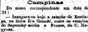 AO LADO: Inaugurada a estação de Restinga em 24 de junho (O Estado de S. Paulo, 26/6/1897). |