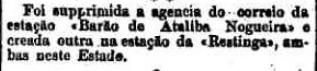 AO LADO: Implanta-se agencia postal em Restinga (O Estado de S. Paulo, 11/8/1898). |