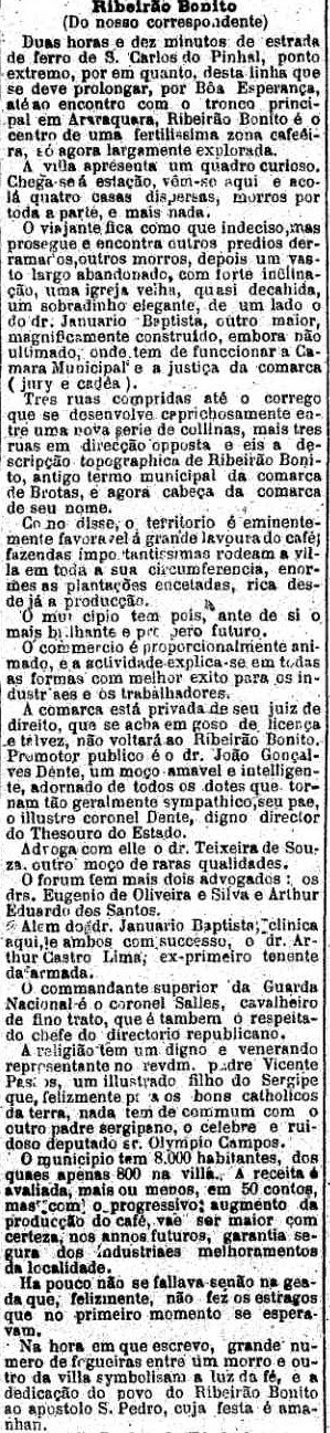 AO LADO: A cidade de Ribeirão Bonito em 1895, pouco mais de um ano após o ramal da Paulista ter diso inaugurado - CLIQUE SOBRE A FIGURA PARA LER O ARTIGO TODO (O Estado de S. Paulo, 4/7/1895). |