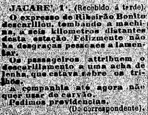 AO LADO: Descarriilamento em Ribeirão Bonito (ou na estação de Jacaré, talvez? (O Estado de S. Paulo, 08/1895). |