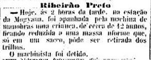 AO LADO: Criança morre atropelada por maquina nos trilhos (O Estado de S. Paulo, 31/03/1900). |