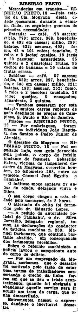 AO LADO: Cargas durante a semana na estação de Ribeirão Preto e na sequencia fala sobre o desastre com o trem em Tambau (O Estado de S. Paulo,