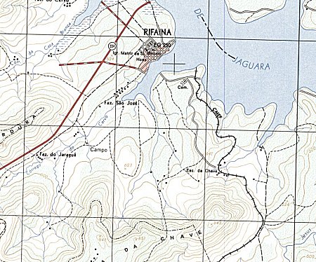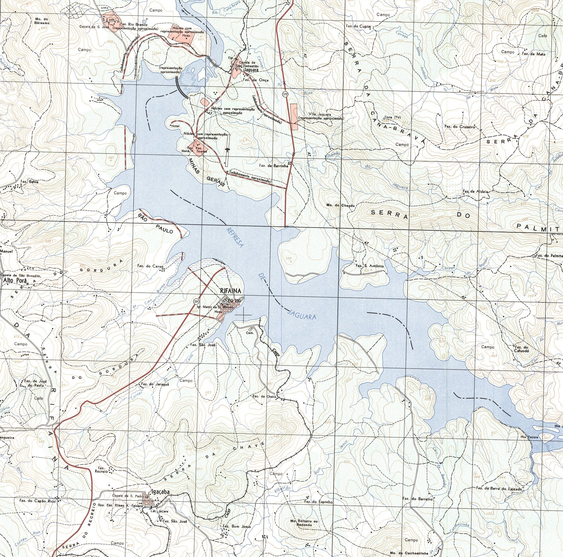 ACIMA: A estação de Jaguara, no centro do mapa dos anos 1970. Notar a linha de Mogiana sendo interrompida um pouco antes da cidade de Rifaina e prosseguindo por baixo d'água, ou seja, já inútil. Na época do mapa, a estação nova ainda não existia, somente seria construída em 1990 quando ali passou a linha turística que apenas funcionou por 5 anos - CLIQUE SOBRE A FIGURA PARA VÊ-LA MAIOR - (IBGE). |