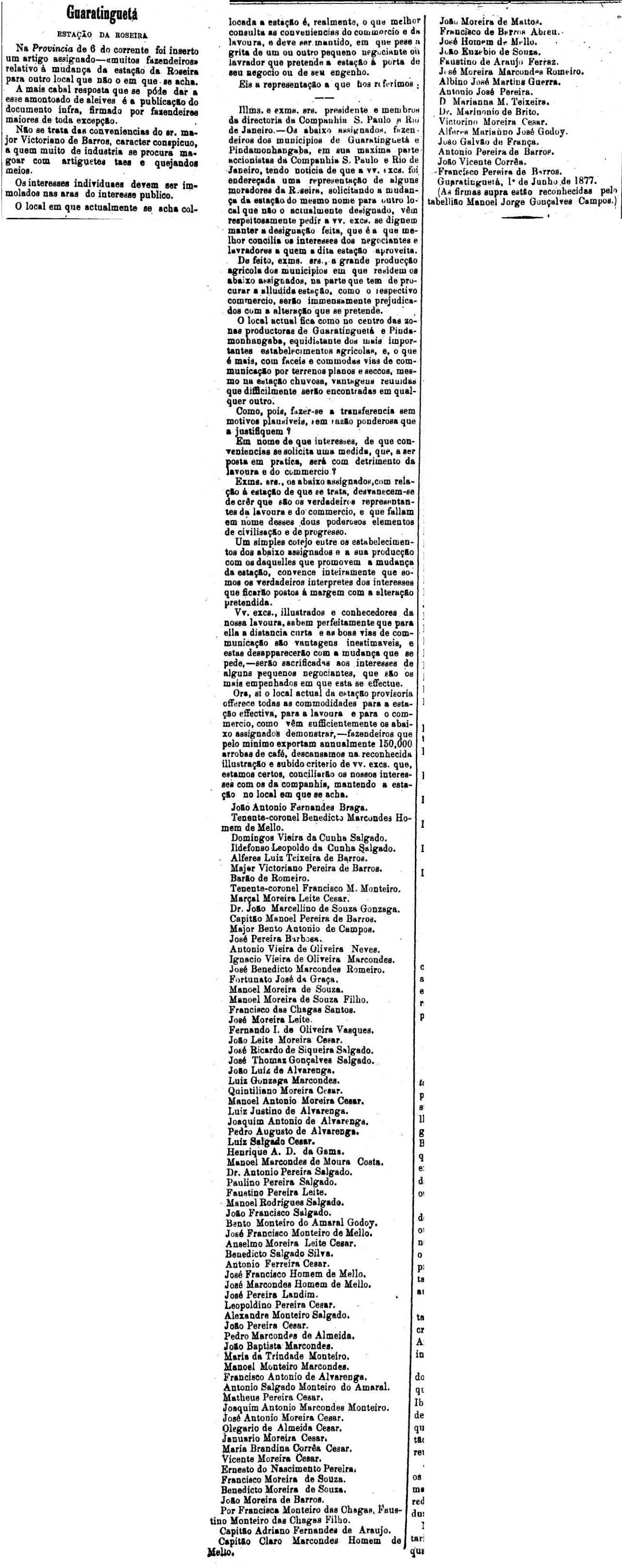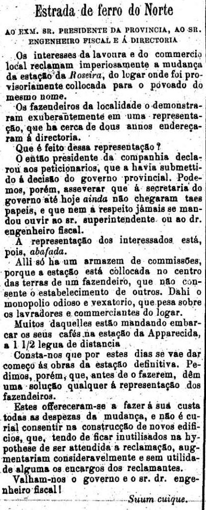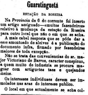 AO LADO: Os descontentes de Roseira protestam quanto à localização da estação - mas não adiantou nada - CLIQUE SOBRE A FIGURA PARA VER TODA A NOTICIA (A Provincia de S. Paulo, 24/06/1877). |