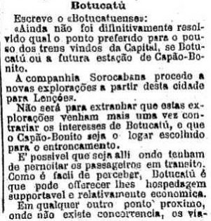 Em 1895, a Sorocabana ainda estava em dúvida se usaria sta estação, que estava prestes a ser inaugurada, como a principal da cidade de Botucatu, ou se continuaria a usar a outra, aberta desde 1889 e que já tinha o nome da cidade. Ela dera distante do centro, mas a de Capão Bonito também era e ia dar saída para o ramal de Bauru (veja caixa abaixo, de 1895).