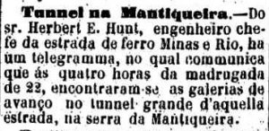 AO LADO: No dia 22 de março, encontravam-se as duas partes do túnel que divide os dois Estados, SP e MG (A Provincia de S. Paulo , 25/3/1883). |