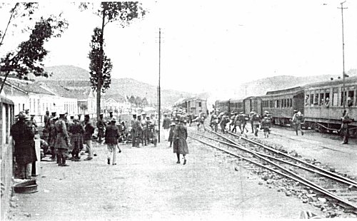 ACIMA: No patio da estação em outubro de 1930, durante a revolução