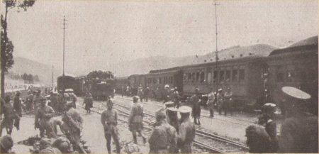 desse ano. Ao seu lado, soldados. Ao fundo, a estação