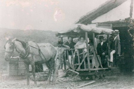 ACIMA: O precaríssimo bonde a burro da linha São Gonçalo-Campanha (Autor desconhecido, época provável: 1910-1920).