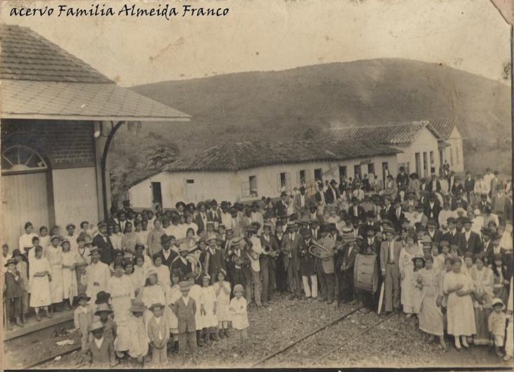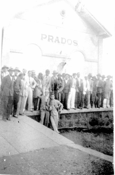 ACIMA: Um grupo de cidadãos locais na estação de Prados. O primeiro da esquerda para a direita, em cima é o meu tio avô Manoel Gonçalves e o segundo é o meu avô José Neto. Aproximadamente 1930 (Acervo Eduardo Lanna Malta)