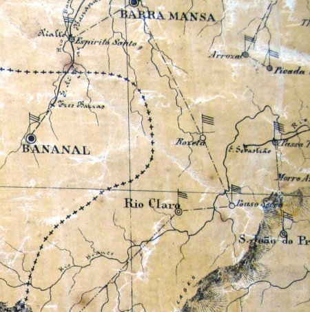 ACIMA: Mapa do final do século XIX mostrando agenvias postais e ferrovias da época. Notar a linha da Pirahyense que mostra como terminal a pouco conhecids estação de São Sebastião (à direita do mapa, parte central) (Cessão Paulo Novaes).