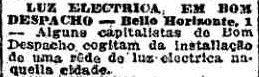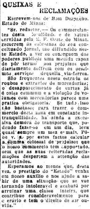 Nota do autor deste site: até essa inauguração (em 1921), a cidade parecia ser atendida à distância pela E. F. Oeste de Minas, numa estação próxima. As duas linhas eram bastante próximas na região de Bom Despacho: é interessante ler no caixa abaixo, de 1917, quatro anos antes, reclamações do serviço de pessoas da cidade de Bom Despacho, que, conforme se percebe, ainda não tinha a sua estação da E. F. Paracatu. - episódio a ser confirmado por este autor.