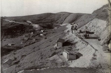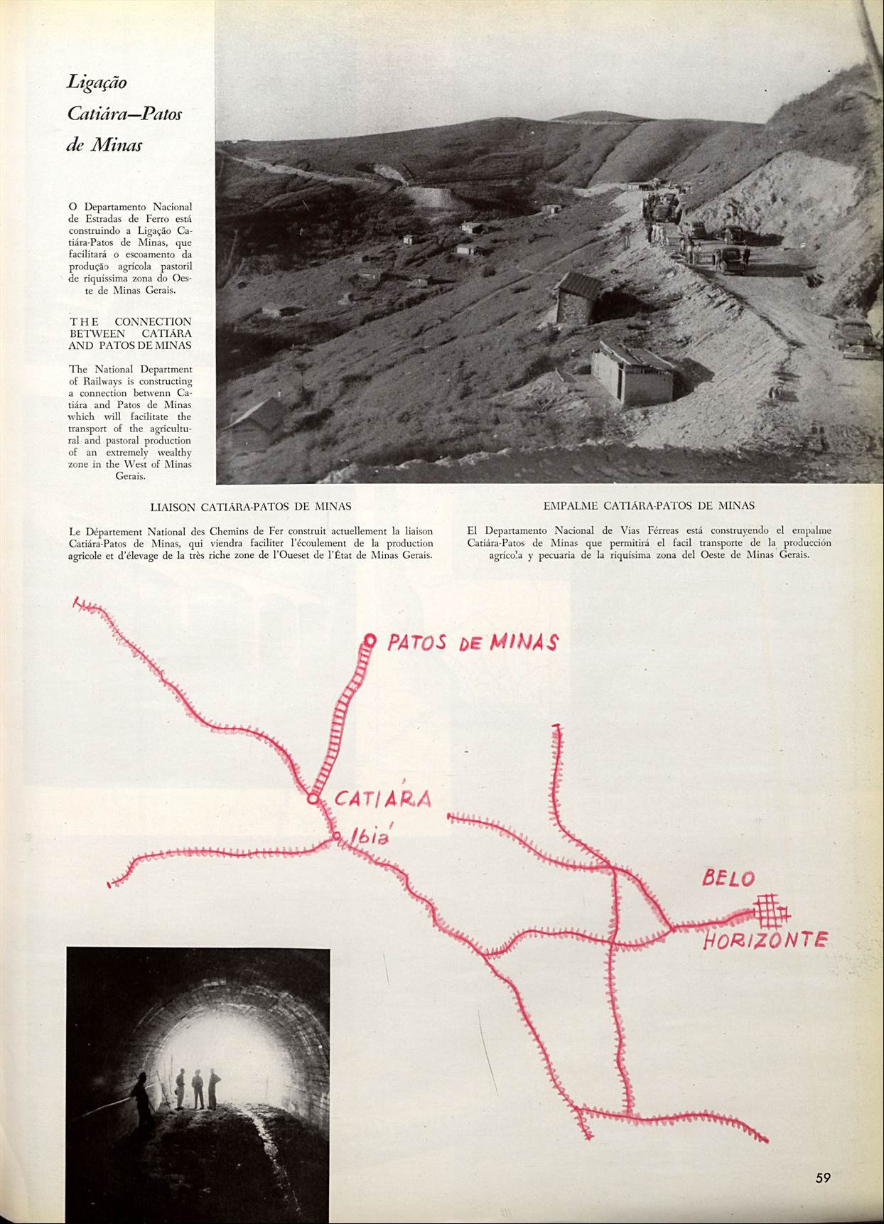 ACIMA: O Departamento Nacional de Estradas de Ferro está construindo a ligação Catiara a Patos de Minas, que facilitará o escoamento da produção agrícola pastorail da riquíssima zona do Oeste de Minas nos anos 1950. Até onde foi possível saber, as obras pararam sem que o ramal fosse terminado - CLIQUE SOBRE A FIGURA PARA VÊ-LA EM TAMANHO MAIOR (Revista Brasil Constrói da época).