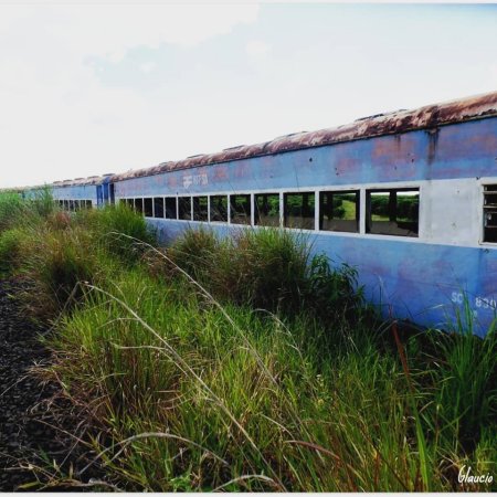 ACIMA: Foto colorida diurna mostrando alguns carros de passageiros de aço carbono com pintura da RFFSA abandonados na estação de Inspetor Quirino (Foto Glaucio Henrique Chaves em 2018).