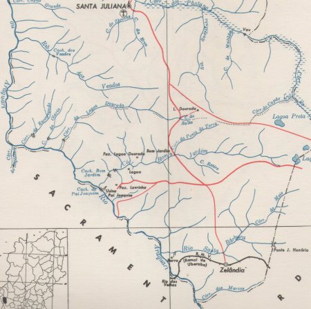 de Zelândia, em mapa parcial do municipio de Santa Juliiana nos anos 1950. Aqui se vê a distancia entre a sede do município, no alto, e a estação e a linha que o cruza, na parte inferior do mapa - CLIQUE SOBRE O MAPA PARA VER O MUNICIPIO INTEIRO (IBGE: Enciclopedica dos Municipios Brasileiros, 1959).