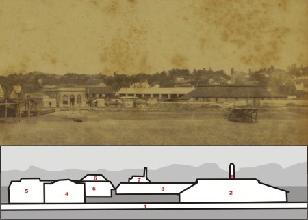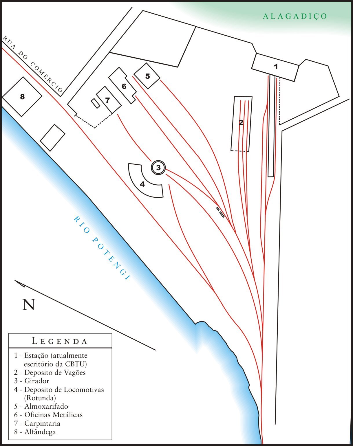 seu enorme telhado (2), os armazéns de vagões (3) as oficinas (5),