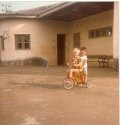 ACIMA: Crianças, filhos do agente da estação, brincam na plataforma da estação de Cerro Chato (nova), por volta de 1970 e