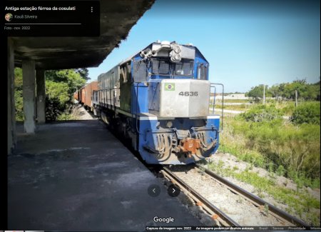 ACIMA: Estação da Cosulati e trem cargueiro passando, em foto Google em 11/2022)