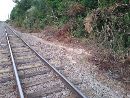 ACIMA: Os restos da plataforma da estação quase engolida pelo matagal em 2022 (Foto Victor Hugo Langaro).