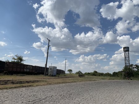 ACIMA: Da estação só sobraram o banheiro (a pequena construção branca) e a linha com alguns vagões parados, ou passando por ela (Foto Leonardo Agare em 12/3/2020).