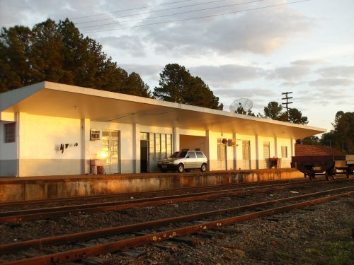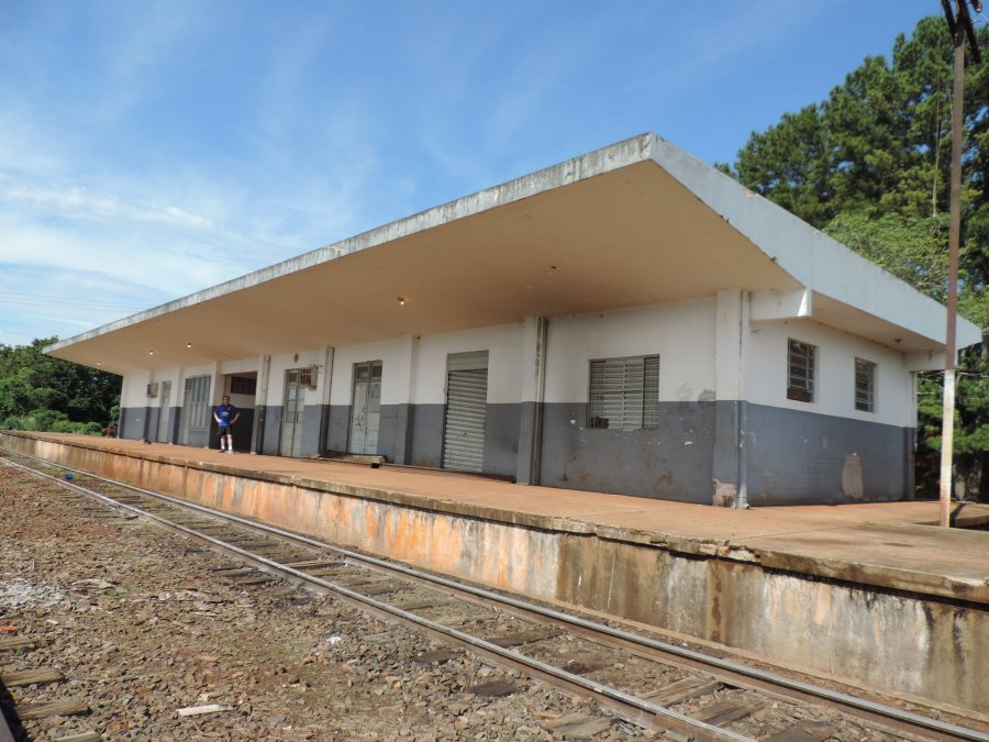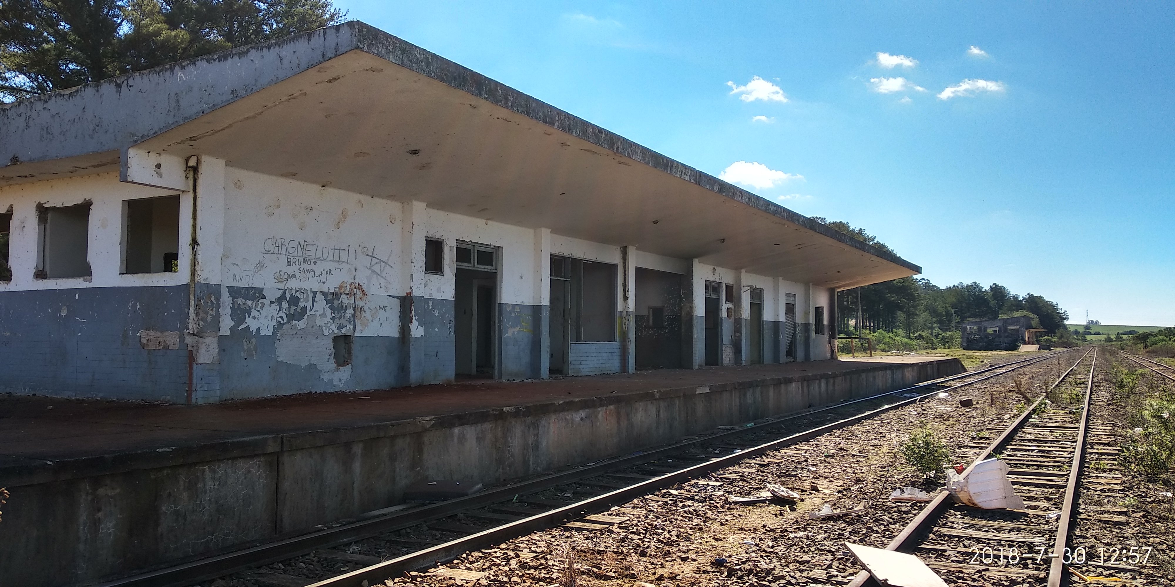 pela plataforma: "Assim como quase todas estações do RS, está destruída, do mesmo jeito que o armazém que ficava logo depois dela. Todo o pátio ferroviário que tinha em volta (casas, campo de futebol, pracinha, alojamento de maquinistas, etc) ou foi destruído, ou foi invadido. O que tinha de terreno vazio também foi ocupado. Inclusive não é um local muito seguro de se visitar, mesmo durante o dia. Morei lá em 1987, pois meu pai era agente de estação. Era um lugar muito tranquilo e cheio de gente...hoje, só abandono e invasão" (Fabiano Seidelles dos Santos, 11/2018).
