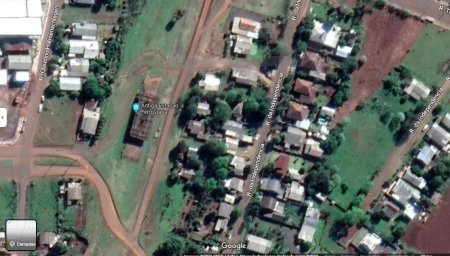 ACIMA: Vista aérea da cidade de Cerro Largo, onde a estação aparece como uma construção isolada na metade esquerda da foto - CLIQUE SOBRE A FIGURA PRA VÊ-LA MAIOR - (Google Maps, 2023)