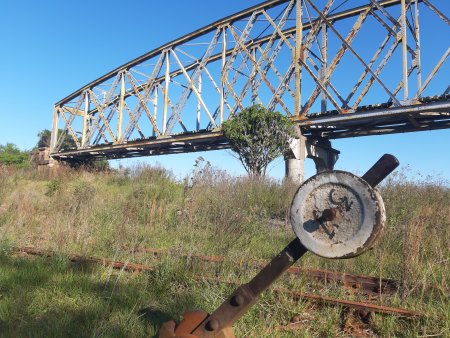 ACIMA: Ponte sobre o rio Santa Cruz em Cacequi, em 2021 e, sob ela, um desvio de um antigo pátio de carregamento de areia que fica embaixo da ponte, que está abandonado desde meados de dos anos 2010, embaixo da areia e do mato. Ainda pode se ver tanto os desvios quanto as alavancas dos AMV's. A ponte tem mais de 1 km de comprimento. Este trecho da ferrovia encontra-se com baixíssimo movimento de cargas, desde 2016 com a desativação da linha ate Uruguaiana, e o fechamento do porto seco alfandegário em Santana do Livramento (já no ramal que liga até os desvios até o mesmo) essa ponte só e utilizada na safra para trazer soja e/ou trigo da estação tigre, que fica adiante na linha (Foto Augusto Taschetto em 8/5/2021).