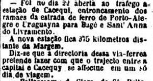 de Cacequi foi inaugurada em 22 (ou 23) de dezembro de 1890 pela E. F. Porto Alegre-Uruguaiana.