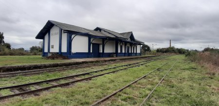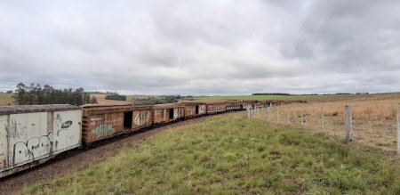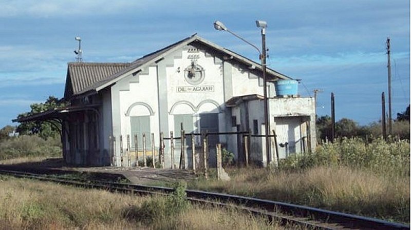 ACIMA: Estação de de Dilermando de Aguiar em 2019.no ramal de são Borja, pois em Dilermando, a alguns metros da estação existe o triangulo onde parte o ramal, e desde o km 0+360 ate o km 7 do ramal de São Borja, os vagões são ou acidentados ou para transporte de produtos nos quais não são mais transportados na malha (Foto Augusto Taschetto em 10/8/2019).