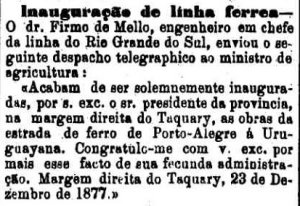 AO LADO: Inauguração das obras na linha entre Margem do Taquari e Cachoeira (A Provincia de S. Paulo, 28/12/1877).