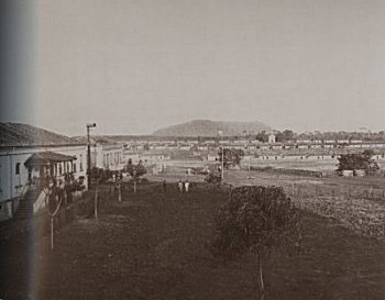 ao fundo, a colônia, com a igreja ao centro, em 1900; Vista do local da