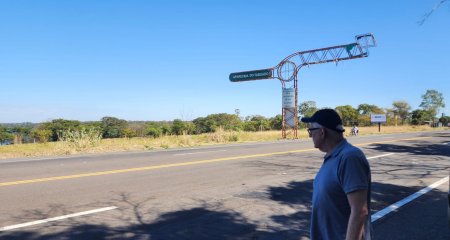 ACIMA: A estação de Santa Fé do Sul fica em São Paulo: depois dela, atravessa-se a ponte rodoviária, onde os trens seguem a linha para o Mato Grosso do Sul, saindo da parte de baixo da ponte, e a rodovia segue o seu caminho dentro do mesmo estado. A placa de sinalização estranha mostra o nome na placa azul: "Aparecida do Tabuado" (Foto Gilson Marques. Na foto de 24 de julho de 2023, o autor deste site).